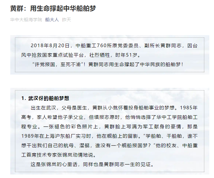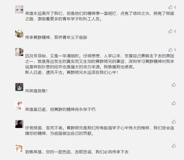 官方公众号推送了一篇名为《黄群:用生命撑起中华船舶梦》的推文,以纪念黄群校友舍生忘死的壮烈情怀。在文章评论区,有同学留言评论道:“许党报国,至死不渝。黄群师兄是我们所有船海学子心中伟大的榜样,我们定会追随您的精神,为祖国做出自己的贡献”