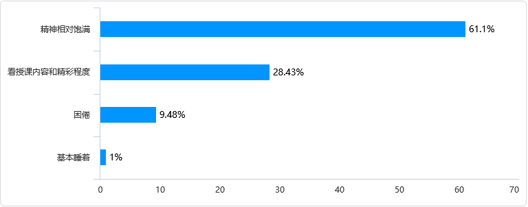 在精神状态方面,超过六成的同学能够保持精神饱满的状态(61.1%),有较高的学习效率,38名同学(9.48%)在上课期间感到困倦,效率不高。与此同时,28.43%的同学认为自己的精神状态取决于老师的授课内容和精彩程度。学习状态与外部环境有着一定关联,线上教学对教师的教学形式和方法提出了新的更高的要求。