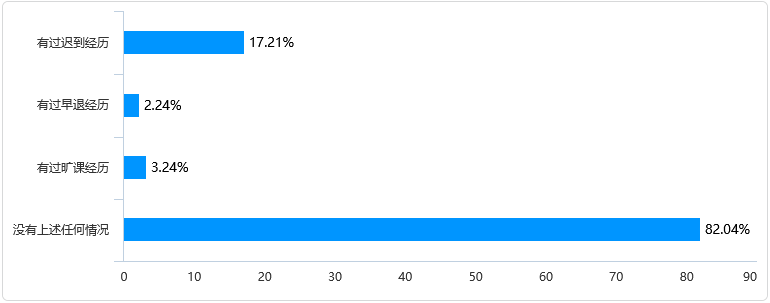 根据统计结果(多选题),17.21%的同学表示曾经有过迟到行为,发生过早退和无故旷课现象的同学分别占2.24%和3.24%,绝大多数同学(82.04%)反馈在线上课堂进行期间没有过任何违规行为。线上课堂的整体出勤率比较理想,这也反映了华中大船海学子踏实严谨的学习态度和严于律己的自我要求。