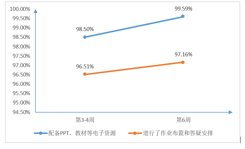 从教学资源和课后任务来看,几乎所有课堂都配备了课程PPT、教材等电子资源,同时进行了作业布置和答疑安排,相关数据较前期有了一定提升。