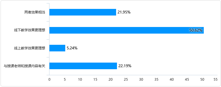 对比线下教学效果,仅有5.24%同学认为线上课程具有优势,超过50%的同学更加认可传统的实体课堂上课形式,约有20%的同学认为两者效果相当。此外,与精神状态统计结果类似,22.19%的同学强调了授课教师和授课内容等外部条件的影响。