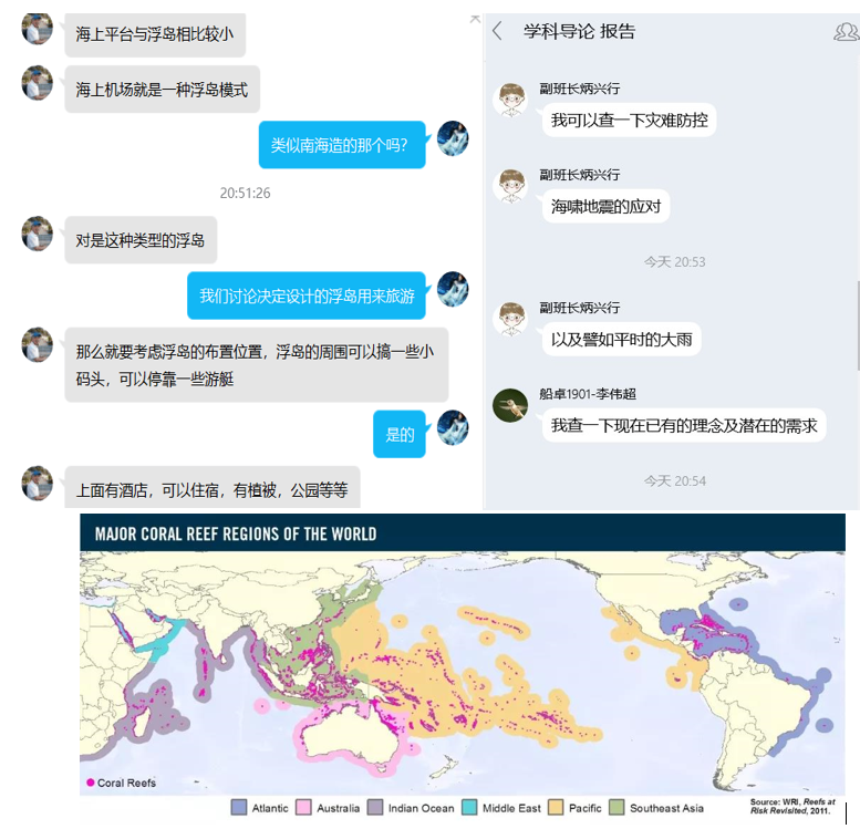 《学科导论》是我们上的第一门专业课程,也是我们上的第一个以论文报告代替考试的课程。在前几周的课程中刘敬喜老师与我们积极互动。第二周周四,我们得知了论文报告的具体要求。下课后,我们自发组成了小组,利用网络平台积极进行讨论。我们原计划选择参考题目三的第四个小题目——海上人工岛设想,经查阅资料,海上人工岛是用填海造地的方法进行的,为了更多地体现专业特色,我们将题目改为《海上人工浮岛设想》。