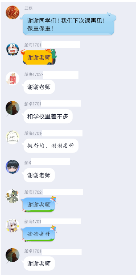 首次进行远程授课,同学们的心情都很特别,船海1802班班长牛智策对此感触尤深:“第一次进行远程上课,特别担心学习效果不好,课前我做了很多准备,提前预习了相关知识。张老师讲的很接地气,把我本以为深刻的概念讲的很轻松,很简单,和在教室上课差不多,很期待下一次课程”。