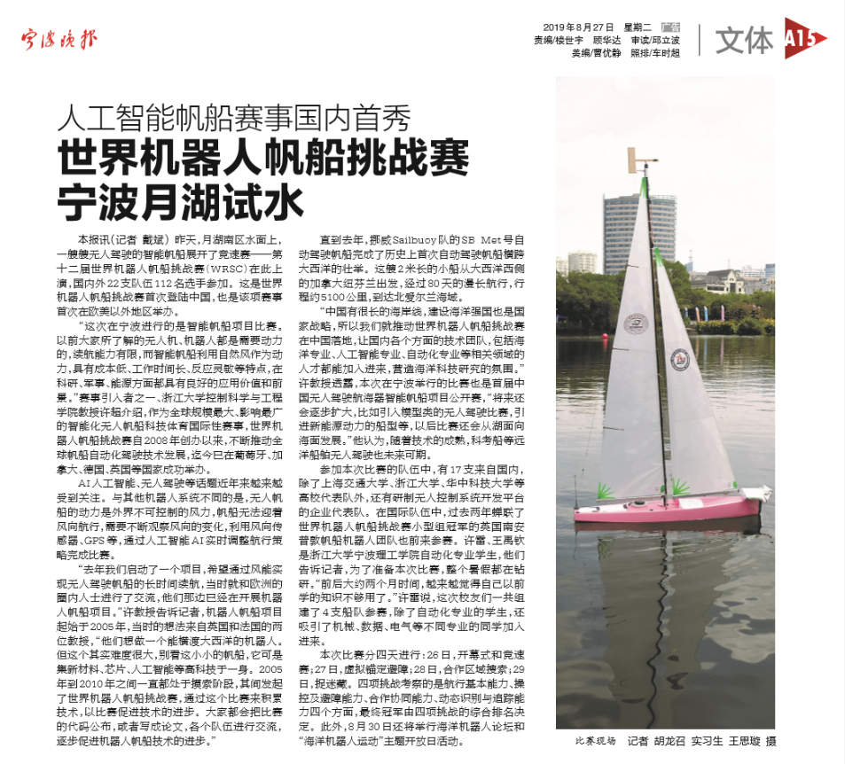2019年8月25日-30日,首届中国无人驾驶航海器智能帆船项目公开赛暨国际挑战赛及海洋机器人论坛于中国宁波举行。WRSC(全称:World Robotics Sailing Championship,世界机器人帆船锦标赛)先后在奥地利、葡萄牙、加拿大、德国等多国举办,是无人横跨大西洋智能帆船挑战赛的衍生赛事,是全球规模最大、影响最广的智能化无人帆船活动。