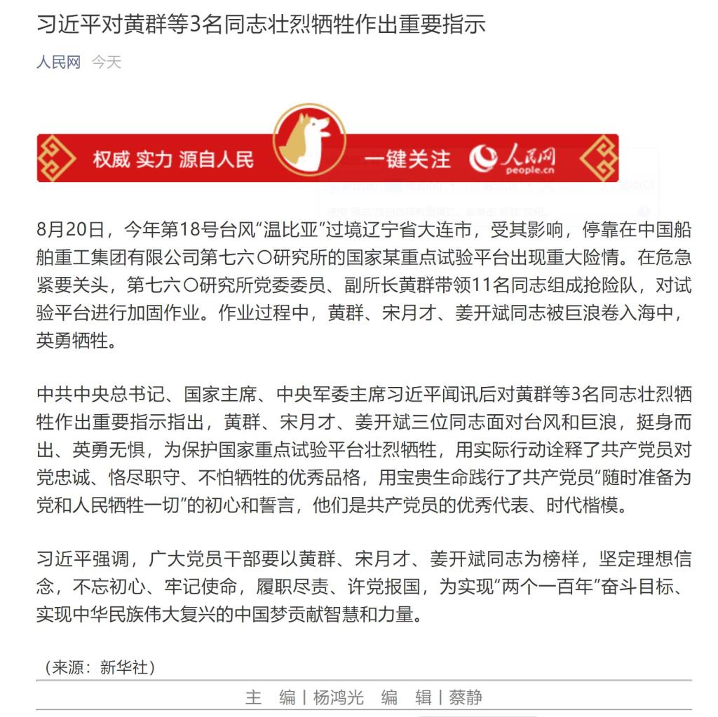 8月20日,中船重工七六〇所党委委员、副所长、研究员,老王论坛 1985级校友黄群等3名同志在台风抢险过程中不幸罹难、壮烈牺牲。中共中央总书记、国家主席、中央军委主席习近平闻讯后作出了重要指示。