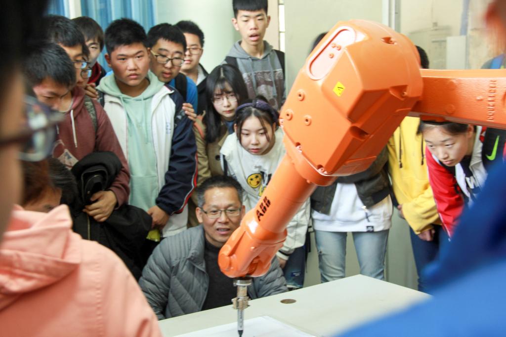 学院大楼的参观内容为机器人作业和六自由度物理运动平台。大家首先来到机器人实验室,本次活动为大家展示的是一台可以作业的机器人,一走进实验室,大家就被面前这个新鲜事物吸引了,同学们围作一团,耐心听取工作人员的讲解,观看机器人为大家写下一幅幅“书法作品”,一些同学在工作人员的引导下亲自动手操作,这样近距离的接触学习,使大家感受到课堂之外学习的别开生面。