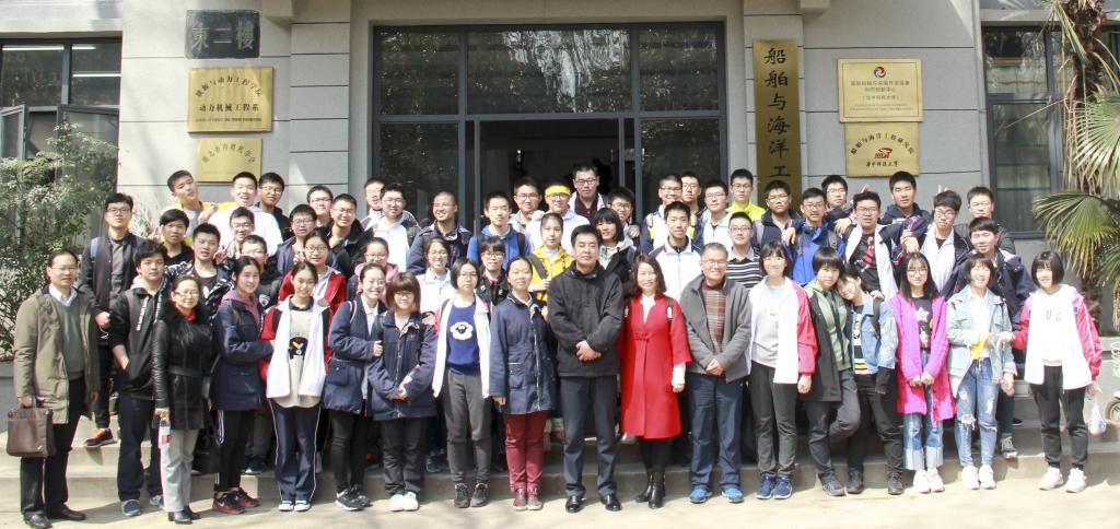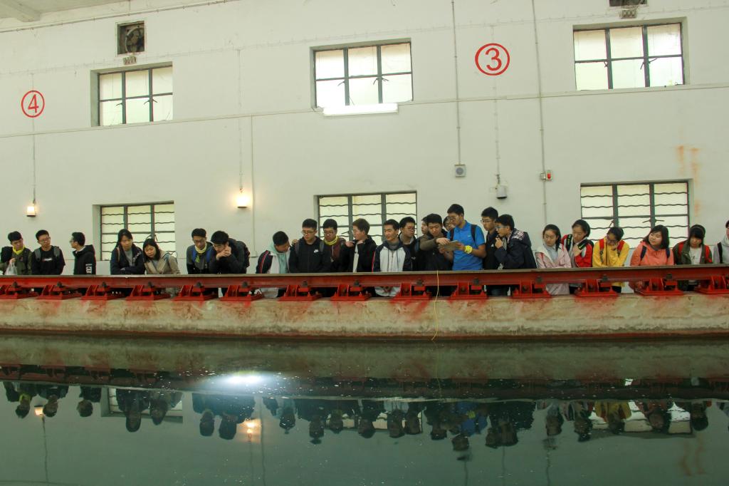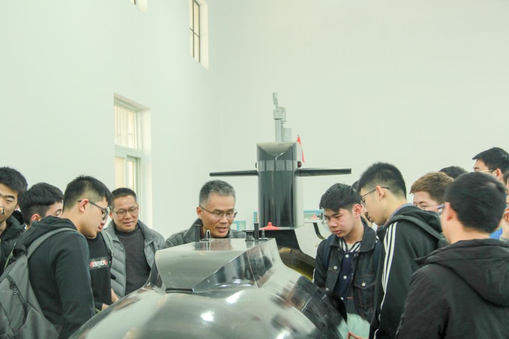 而后,同学们来到拖曳水池实验室继续参观活动。实验室于1977年建成,1987年4月24日被接纳为国际船模拖曳水池会议(International Towing Tank Conference,简称ITTC)正式成员,也是水动力湖北省重点实验室的主要依托单位。实验室水池长175米、宽6米、水深4米,实验室使用面积约3600平方米,是高校系统规模较大的船池。拖曳水池实验室的参观活动有潜艇模型拆装和水下机器人。在潜艇模型拆装实验室,船舶与海洋工程系主任李天匀教授深入浅出地为大家讲解潜艇的内外部结构、各部位的功用,幽默的讲解时不时引来大家的阵阵笑声,气氛欢乐而融洽。