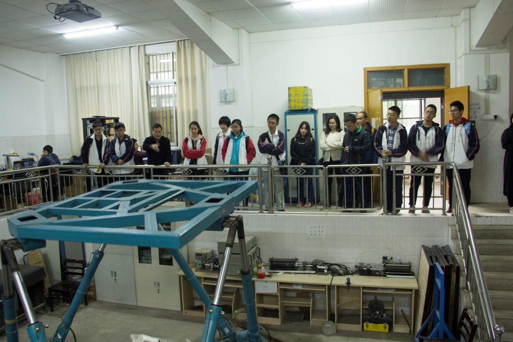 在六自由度运动仿真实验室,李维嘉教授首先为大家介绍实验室的基本情况。六自由度运动仿真实验室建于2002年,用于开展舰船、飞机、汽车等空间运动体的运动仿真技术研究,具有六自由度运动平台及视景等实验装置,同时还承担“舰船运动仿真技术”研究生课程的实验与教学任务。随后展示了六自由度运动平台的各种运动姿态,并结合实时运动,为大家详细介绍平台的运动原理和控制方法,尤其是了解到运动平台用于训练飞行员及潜艇艇员时,同学们展现出极高的热情,踊跃提出问题,李维嘉教授一一做了深入解答。