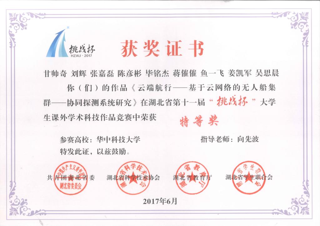 向先波老师指导的学生团队作品“云端航行——基于云网络的无人船集群协同探测系统研究”,荣获本届“挑战杯”省赛的特等奖。