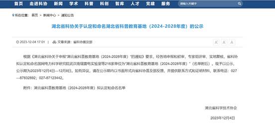 成功获评“湖北省科普教育基地(2024-2028年度)”。