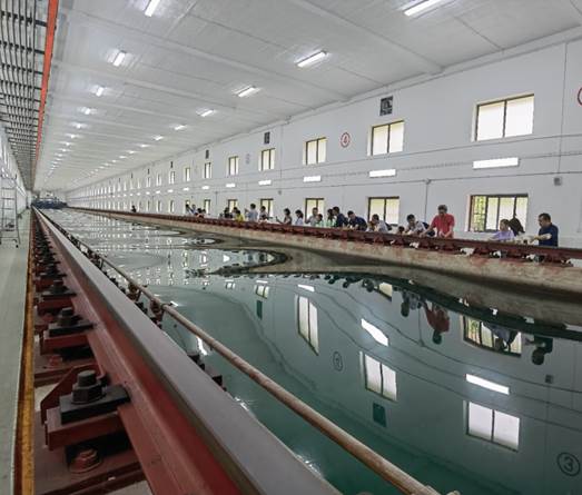 实验中心主任冯大奎教授、高级工程师宋磊带领学生先后参观了舰船模型展厅、流体力学实验室、船模拖曳水池。
