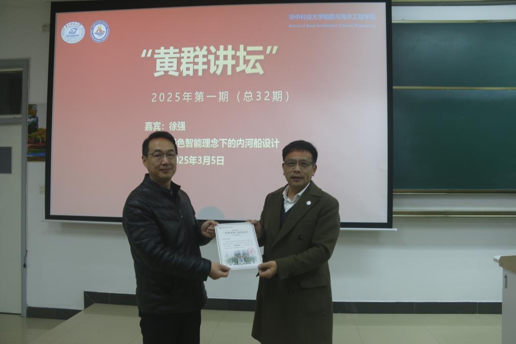 3月5日晚七点,东九楼B101,校友徐强做客2025年第1期(总32期)"黄群讲坛",围绕"绿色智能理念下的内河船设计"这一主题与在校学生进行了分享交流。院长李威、党委副书记李周密及副教授李家盛出席本次活动。