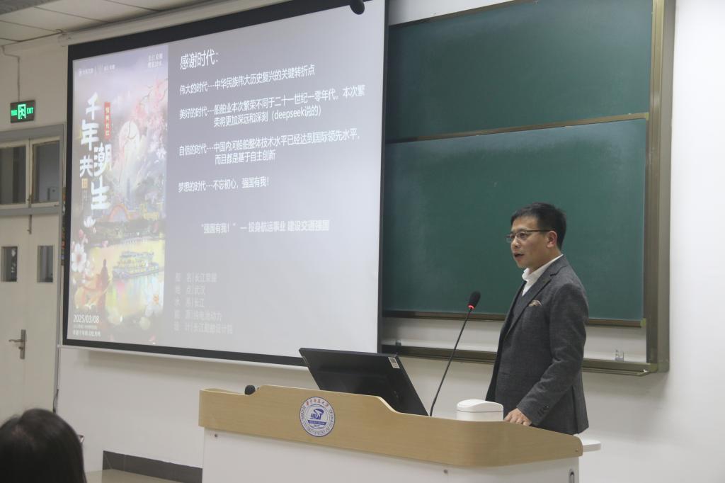 讲座期间,徐强以中国造船业发展现状为切入点,深入剖析"中国内河航运发展现状"与"内河绿色智能科技创新实践"两大板块内容。他指出,当前中国内河航运已迈入高速发展阶段,长江货运量持续稳居全球首位,并且在船舶绿色智能化转型方面积极探索、成效显著。徐强还结合实船详细介绍了LNG、乙醇、电力、混动等新能源驱动船舶的特点和应用场景。徐强强调,当下正值民族复兴、船舶领域蓬勃发展的关键时期,是充满自信与梦想的时代,他殷切期望华科大船海学子秉持"强国有我"的信念,投身船海事业,助力强国建设。