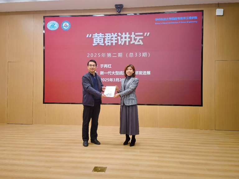 讲座中,于再红首先对中国船舶集团及第七〇八研究所进行了介绍,接着以代表性的船型如"新海虎"耙吸挖泥船、"天鲲号"绞吸挖泥船等为例,详细阐述了中国疏浚装备的发展历程。她点明,疏浚工程作为基础性建设工程,意义重大,挖泥船作为清淤治理、航道维护、港口建设、填海造陆的关键装备,地位不可小觑。七〇八所长期投身国内疏浚装备研发,打造出多款具有"里程碑"意义的产品。她一边回忆研发过程中遇到的困难挑战,一边为同学们科普先进疏浚技术,她鼓励同学们努力学习、勇于创新,积极投身船舶与海洋工程领域,助力海洋强国建设。