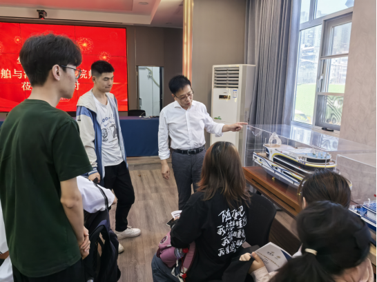 校友徐强对到访师生表示热烈欢迎,并亲自带领同学们前往公司展区参观了该公司设计的多艘代表性船舶模型,详细介绍了不同船舶的设计理念、技术特点、应用场景及研发过程中的创新突破。随后详细介绍了该公司的概况、正在承担的国家重大科技任务以及取得的突出成就。