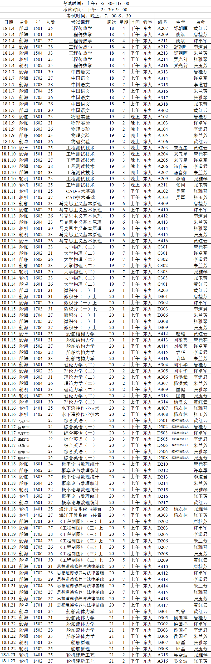 2017~2018学年第一学期考试安排