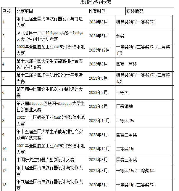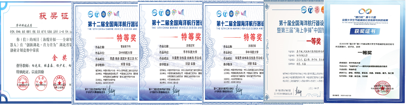 、机械科学与工程学院、环境科学与工程学院、能源与动力工程学院等众多师生,并在互联网大学生创新创业大赛、全国大学生节能减排社会实践与科技竞赛、中国研究生机器人创新设计大赛、全国海洋航行器设计与制造大赛、全国船舶工业CAE软件数值水池应用大赛等国家级重大比赛中取得一定成绩,近年来累计奖获奖29项,其中特等奖6项,一等奖10项,具体获奖情况如表1所示,部分获奖证书如图6所示。