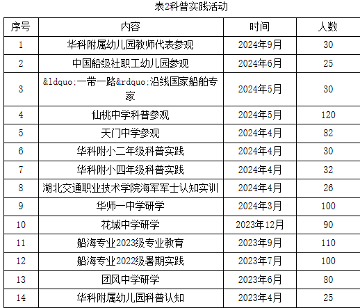 立足学科特点,推进科普教育。船池拖车系统作为极具行业特征的大型仪器设备,充分发挥专业特长和资源优势,将科学普及放在与科技创新同等重要的位置,强化科普责任、提升科普能力、做好科普教育,服务科教兴国战略。近一年来开展幼儿园、小学、中学、大学等实习实践认知14次(表2和图7),扎实做好舰船科普教育工作,推动青少年舰船知识科普工作高质量发展,为国家的海洋强国战略贡献船海力量。
