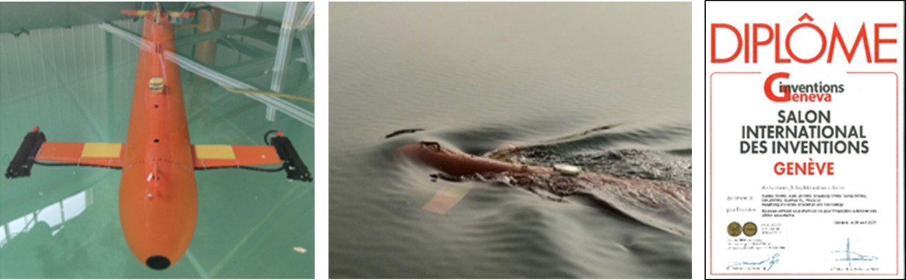 在海洋工程装备方面,主持了大型海洋网箱养殖船的线型优化试验,研究了结构形式、网眼尺寸等多参数对大型海洋网箱养殖船快速性影响。针对在海底掩埋细径海缆(尤其是海底光缆)探测过程中看不清测不准探不明等痛点,船池拖车系统支撑研发了长艏翼飞行式自主探缆水下机器人新型装备,长艏翼水动力总体布局与性能设计,实现高效费比水下自主探测作业,可应用于全球海缆通信系统、海上风电场、水下油气生产系统、海底科学观测网等领域,具有广泛应用前景和显著社会经济效益,该成果参加第48届日内瓦国际发明展,获最高奖项评审团特别嘉许金奖(图3)。