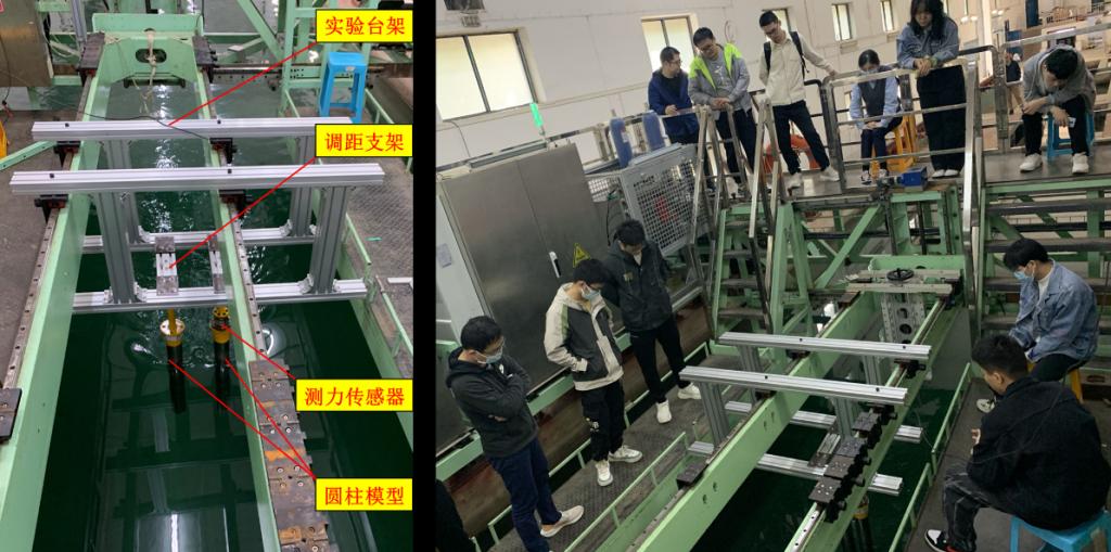 船舶水动力相关教学实验重点研究水流和船体相互作用彼此影响,为了夯实流体力学部分基础知识,依托船池拖车系统已有条件,开发研制了圆柱绕流实验教学装置。如图5所示,该装置采用模块化设计,可便携架置于拖车系统中央测桥,完成单/双圆柱绕流教学实验,单圆柱绕流教学时学生观测不同雷诺数下绕流现象并测量其阻力数据,将无因次化结果与理论值对比完成实验验证;双圆柱绕流教学时,调整圆柱间距,观测不同间距比下绕流场的现象和力学特性。该教学装置巧妙利用了船池拖车系统的拖曳能力和已有的水池条件,拓展了实验教学的广度与深度。