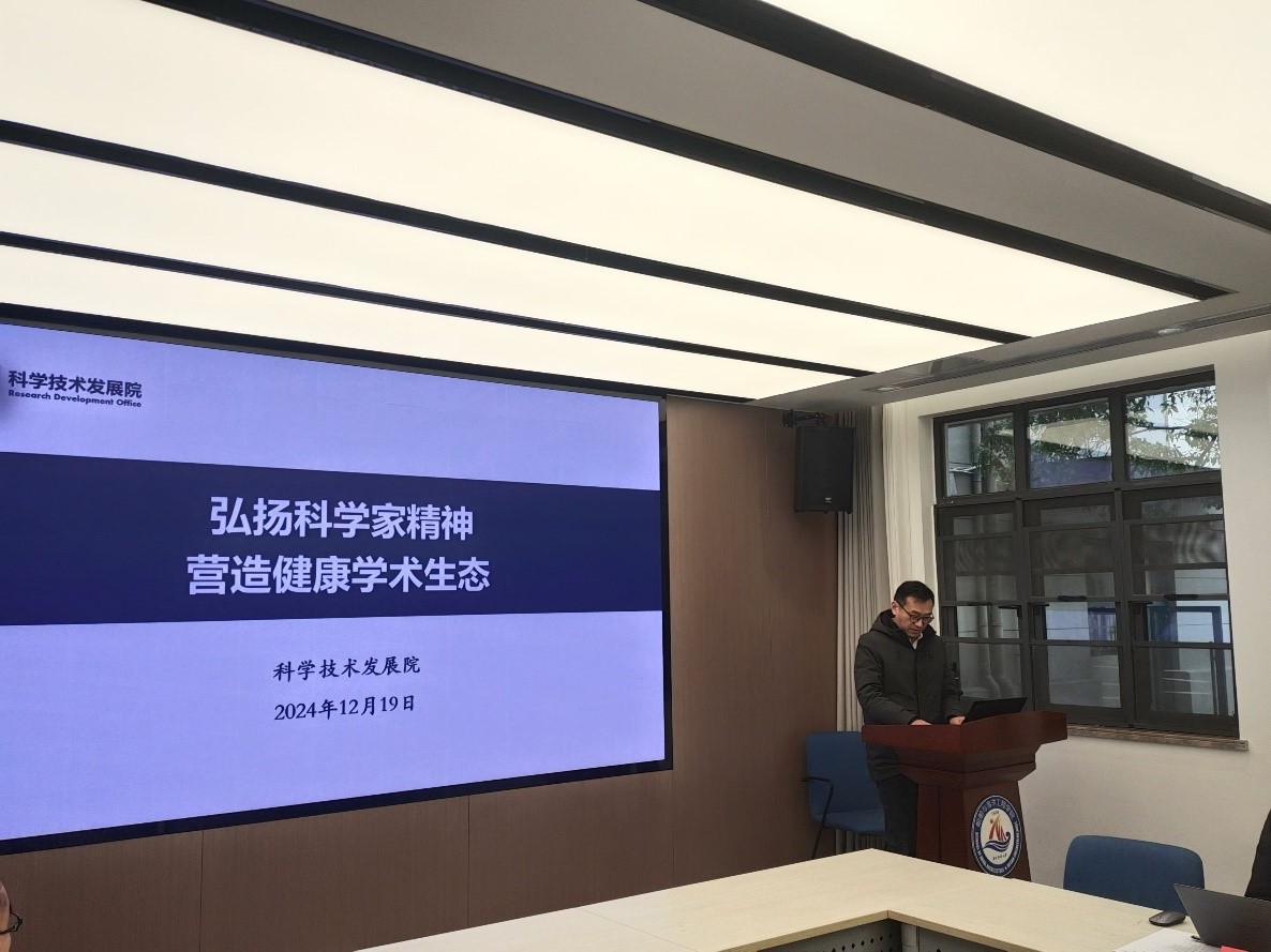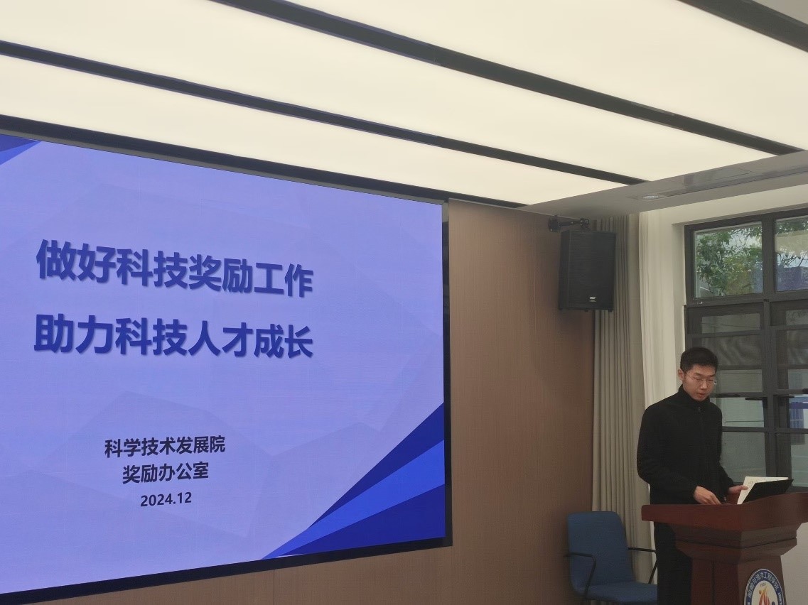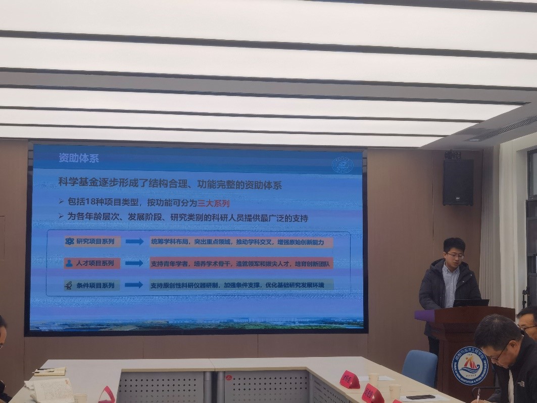 校基金办徐新盛老师从基金委政策动向、学校国基金情况分析、基础研究人才成才路径等方面进行讲解。校奖励办陈书田老师介绍了各类科技奖励政策变化、学校和学院科技奖励分析、有组织科研奖励以及2025年各类科技奖励申报的时间节点等情况。邱进俊主任详细介绍了科研诚信总体形势、科研不端负面影响、科研不端治理机制、个人如何防范科研不端风险等内容和典型案例。