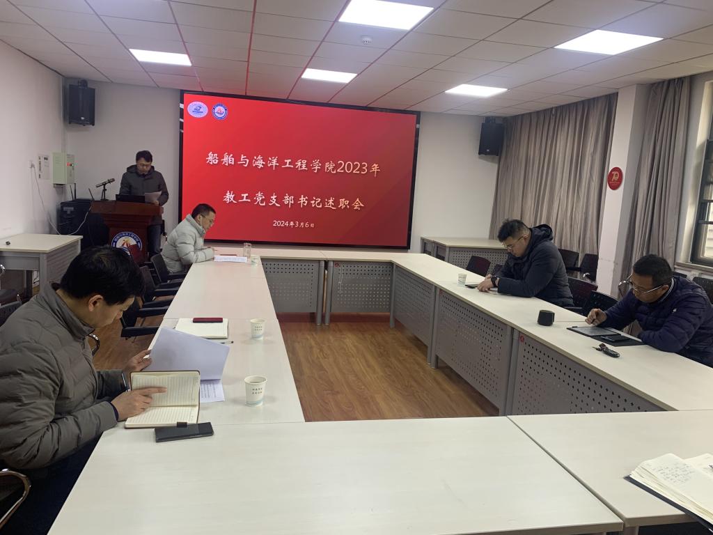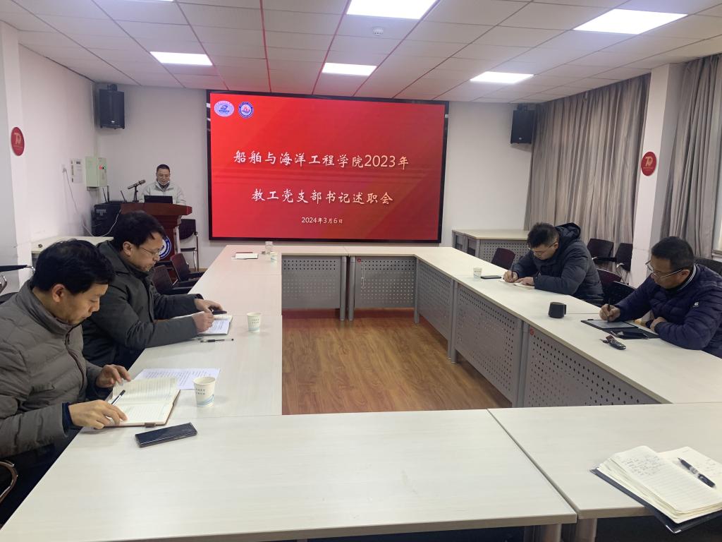 船海系教工党支部书记刘均同志首先作汇报。他重点介绍了党支部学习贯彻习近平新时代中国特色社会主义思想主题教育开展情况、党支部围绕中心工作发挥作用情况、存在的问题与不足、2024年工作计划等内容。这一年,党支部积极参加红色基地研学、组织开展社区定点帮扶活动,助力黄群班建设,开展中心工作发展研讨会,以务实的工作作风推进学院党建工作。