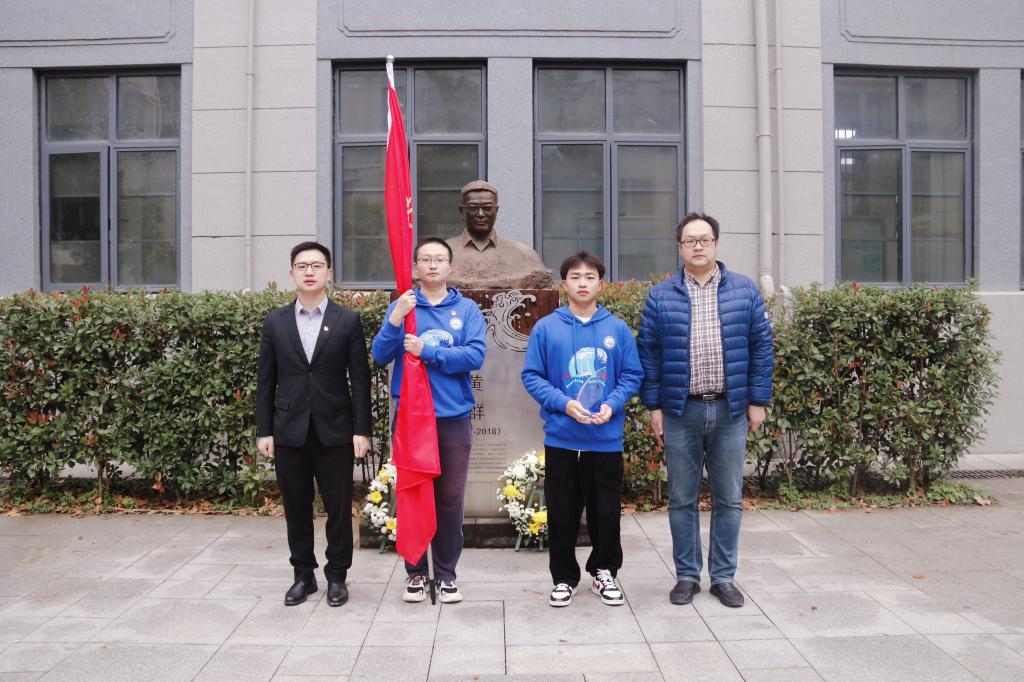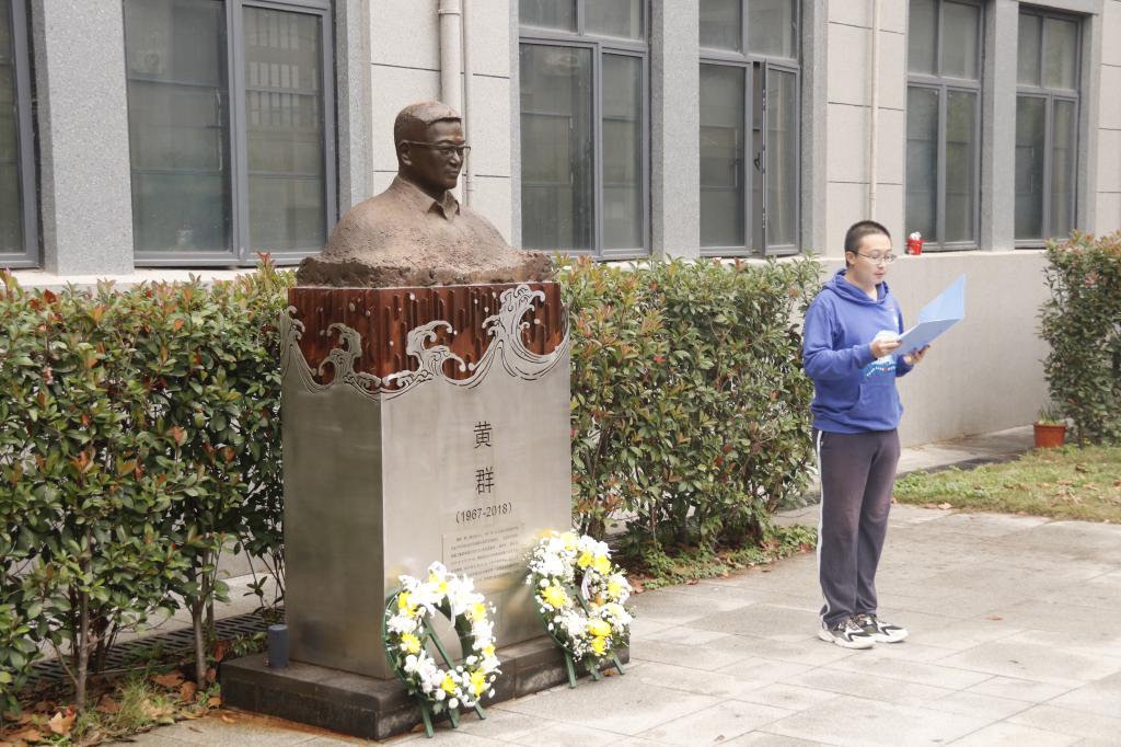 主题团日活动上,船卓2001班团支部团员代表向黄群雕像敬献花环,向英雄校友致敬。