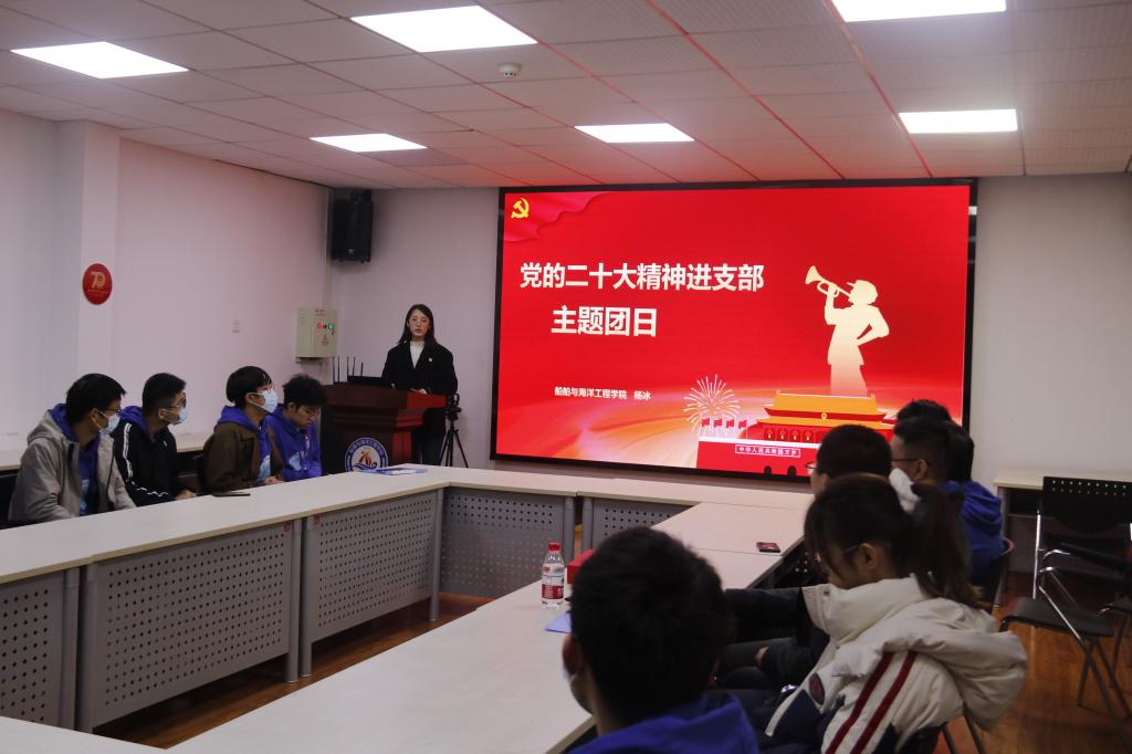 船卓2001班团支部书记殷鹤桐做团支部工作报告,从思想建设、学风建设、科研创新、学生工作、社会实践、志愿服务等多个方面对支部情况进行了梳理。他表示:在黄群精神的引领下,团支部将继续以成为卓越的舰船工程师为目标,只争朝夕,不负韶华,在新征程上,“船”承使命,为海洋强国建设不懈奋斗。