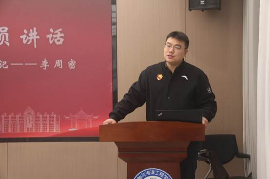 船海研究生第二党支部的杨世博作为支部书记代表进行了发言。他分享了担任党支部书记以来的心得体会,表明自己将不断加强理论学习和业务学习,不断提升思想引领力、任务执行力和支部凝聚力。