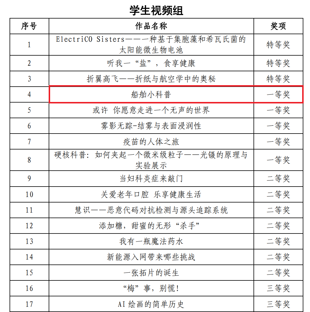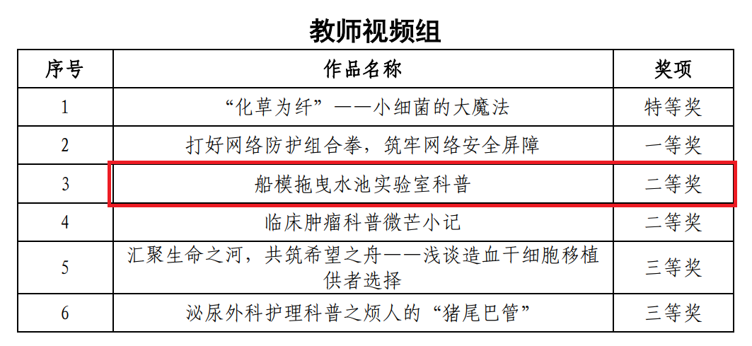 宋磊老师拍摄制作的科普视频《船模拖曳水池实验室科普》获评教师组二等奖;陈昱萤拍摄的科普视频《船舶小科普》获评学生组一等奖。