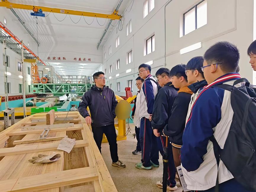 宋磊高工、陈浩工程师、李阳工程师带领学生先后参观了舰船模型展厅、试验调试厅和水池拖车。