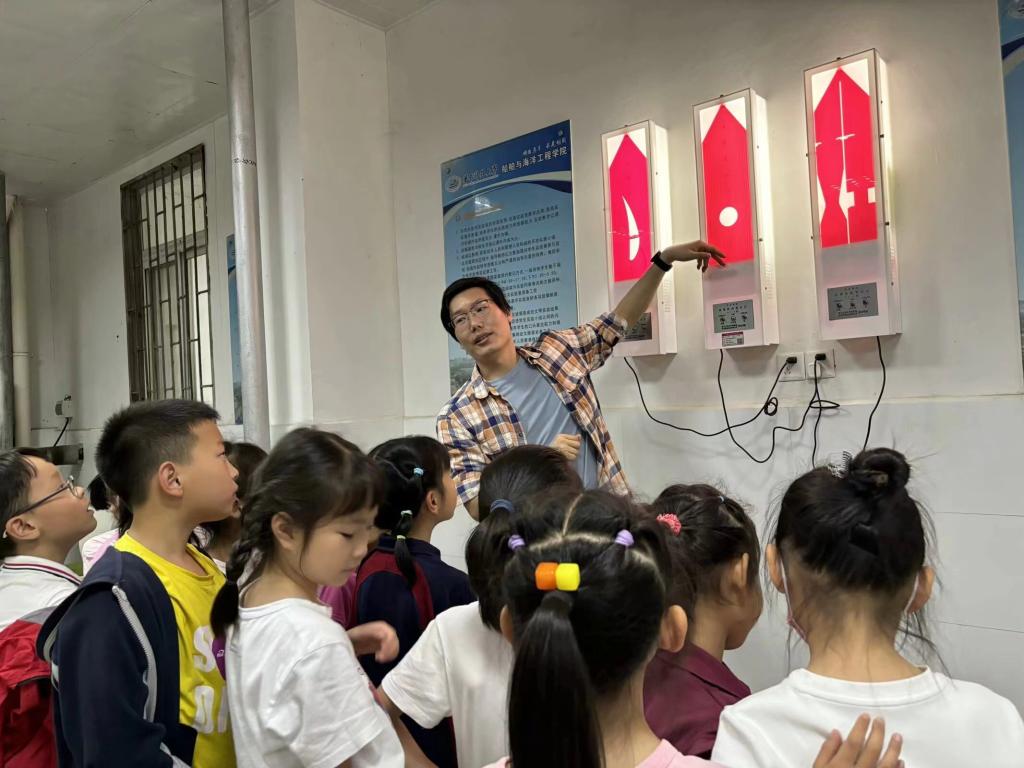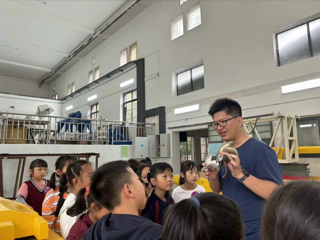 在船模拖曳水池,宋老师为学生们详细的介绍了船用螺旋桨的相关知识,讲解了螺旋桨的结构特点和推动船行驶的原理,现场体验了波浪产生与传播的过程;在流体力学实验室陈老师通过流体力学实验装置生动的为学生们展示了自然界的流动现象,并通过生活中遇到的流动现象举例,形象的描述了其基本原理。
