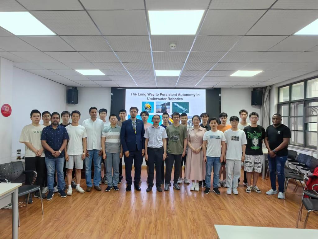 Maurelli教授分享后,同学们积极互动,向其提出问题并交换意见。在这次学术交流活动中,同学们收获颇丰,对自主水下机器人有了更全面、深入的认识。活动最后,同学们给予了热烈的掌声,为Maurelli教授带来的这次精彩分享表示感谢。最后,所有与会人员共同合影留念。